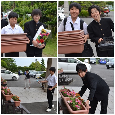 ボランティア委員会のみなさんが、玄関のプランターの花の植え替えをしてくれました。ありがとう。