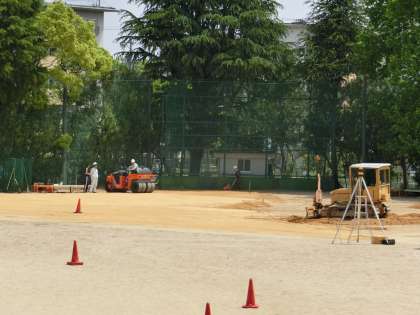 野球部のところ、雨が降ると田んぼ状態だったんです。テスト週間を利用して昨日から土を入れ替えていただいています。(しかし、バレーからテニスまでやっていただきたかったな〜。)