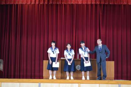 朝会の前に表彰伝達式が行われました。以下の生徒が表彰されました。おめでとうございます。