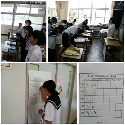 今週から、1年生の学年委員会で企画をした「クラス対抗あいさつ選手権」がおこなわれています。