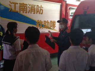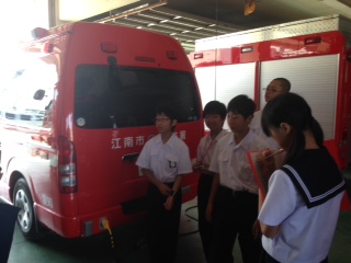 消防署では職員の方から消防車の種類や機能についての説明を聞いていました。