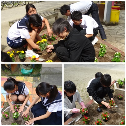 昼放課にボランティア委員の生徒が中庭の花壇に花を植えてくれました。
