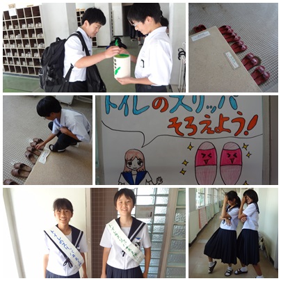 昼放課の1年生フロアをぶらり。「トイレのスリッパそろえ隊」隊員の岡地さん、松田さん、加藤君、林君がトイレのスリッパの状態をチェックし、整頓を呼びかけていました。トイレの平和は君たちによって守られているのですね!みなさん、協力よろしく!