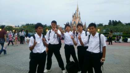 シンデレラ城をバックに男子。50分待ちのスペースマウンテンに並ぶ女子。間に合うでしょうか?