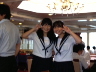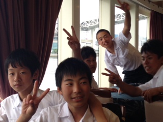 東京湾クルーズでレインボーブリッジの下をくぐるときです。この子達にはロマンより食い気です。橋より箸です!うまい!山田君、サブトン一枚!