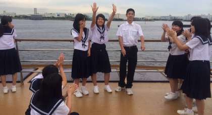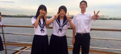 修学旅行中に誕生日を迎えた3人です!船内の学年みんなで盛大な拍手と「おめでとう〜」の乾杯をしました!思い出の誕生日ですね!