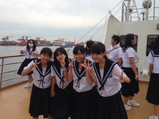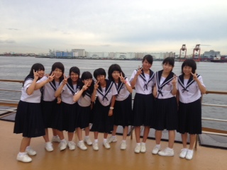 クルーズオープンデッキの上では爽やかな風に吹かれて生徒たちが喜んでいます!題はそよ風に行かれる美少女た!それは言い過ぎかも。