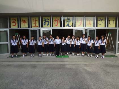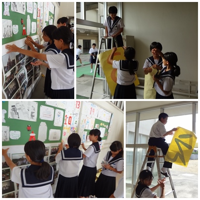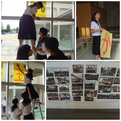 1年生の広報部が修学旅行から帰ってくる3年生のために、「おかえりなさい」メッセージを作成しました。文字の掲示は3年脱履のガラスという高い場所となりましたが、脚立を使ってメンバーが協力しながら行いました。