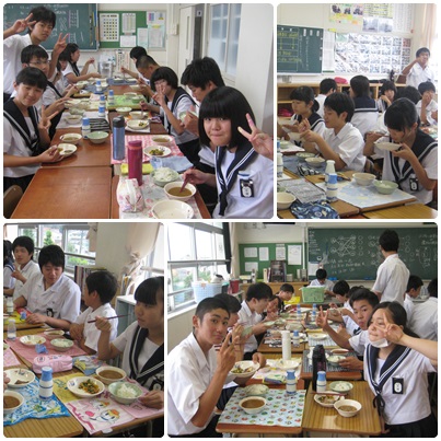 今日は午後から保護者会があるので、4限で授業も終わり、ほっと一息ついた楽しい給食の時間の様子です。今日の献立は、ご飯・魚・味噌汁という和風なメニューでした。