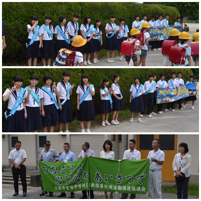今朝は、宮中地区合同あいさつ運動の日です。今日は3年生のチームが地域のみなさんや保護者とともに宮田小学校で元気にあいさつを交わしていました。