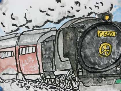 校長室を訪れる方によくほめていただきますこの機関車の絵、佐々陽太君の作品です。画面一杯に描かれた機関車が力強さを伝えてくれます。
