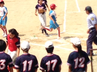 二回の表、栗本さんがヒットで出て、盗塁などで三塁に進み、バスボールの間にホームインしました!