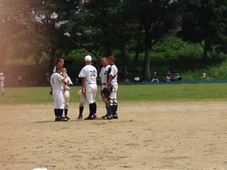 最終回、四球でランナーを出し、その後、ヒットを打たれ、ノーアウト2・3塁の大ピンチです。冨田君、落ち着いて三振を取り、その後、キャッチャーゴロ、最後のバッターをレフトフライで捕り、なんとか逃げ切りました!勝ちました!おめでとうございます!写真はレフトフライ後の勝った瞬間の写真です。