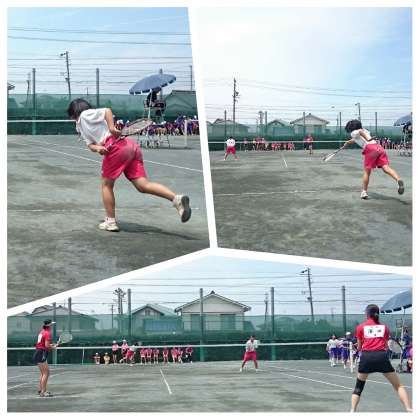 3回戦に進んだ村上・岡崎組は、またまた強豪滝中と対戦しました。(今回、滝中との対戦ばかりです。)しかも、背が高く高校生のような体格のペアです。ボールも速く、前衛の守備範囲も広く、力の差は歴然でした。しかし、蓋を開けてみると、後衛の村上さんが相手のバックを粘り強く攻めてミスを誘ったり、前衛の岡崎さんがモーションをかけて見事にボレーを決めたりと、見ている人が楽しくなるようなプレーが続きました。残念ながら、決定力に勝る滝中に1×4で敗れてしまいましたが、練習してきた成果が発揮された試合でした。
