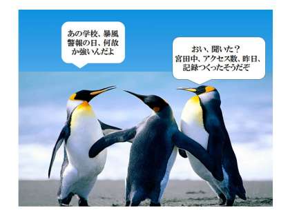 宮田中学校の1日あたりのアクセス数、昨日はレコード記録の4785件でした。従来の記録は4279件で、この日も暴風警報が出るか出ないか、朝方、大変な日でした。修学旅行よりも、体育大会よりもアクセス数が多いとは、さすが宮田中学校です。この記録はしばらくは抜けないでしょう。何故なら、昨日は、朝に家庭待機かどうか心配で1回、後はいつ消えるかで1回、わー消えた、どうしようで1回とこんなにかき回される日はめったにないからです。でもこれは幸せな証拠で、とんでもないことが起きれば1万アクセス位すぐに、いってしまいます。平和な学園がいつまでも続きますように。