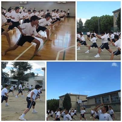 一つのクラスはついに外に出て青空の下、エッサッサの練習をしました。