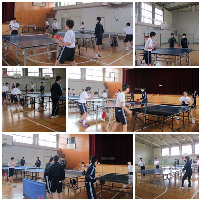 卓球部男子は朝から体育館で練習しています。試合前の長く練習できる日なので休憩も少なめに気合いが入っています。今日は伊藤コーチもみえていますので普段聞けないことを教えてもらっている生徒もいました。
