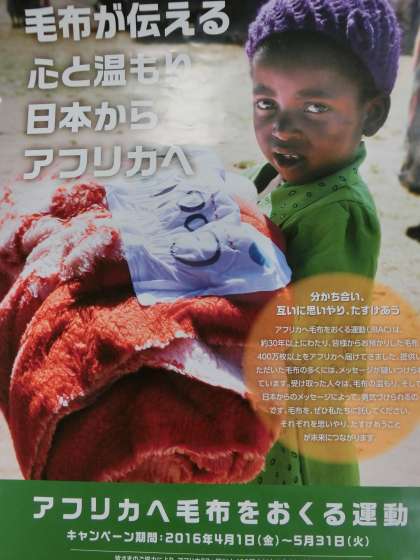 もし、家庭に毛布がありましたなら、洗って学校〔教頭)までお持ち下さい。5月中旬までに持って頂ければ必ずアフリカへ届けさせていただきます。