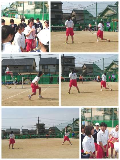 1回戦の江南北部中との対戦は、初戦米原・堀場組が出場しました。少し硬さが目立ち、ファイルゲームまでもつれ込みましたが、3×4で敗れてしまいました。2試合目は、稲波・纐纈組が出場しました。サービスミスでゲームを落としてしまいましたが、4×2で勝利しました。第3試合目は、青山・島岡組が出場しました。安定感のあるプレーで4×0で勝利し、対戦成績2×1で勝利し、2回戦進出です。