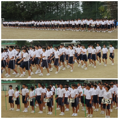 はじめは、入場行進の練習の写真です。前列は、いろいろな人から見られることを意識して、かっこよく行進することができました。後列の人も前列に続いて、堂々と行進しましょう。