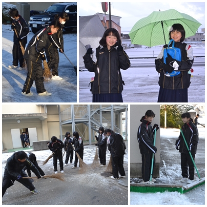 今朝は路面が凍結し、道路も校内の通路もとても滑りやすい状態でした。今朝は活動していない部もありましたが、女子バスケット部のみなさんが、早朝より雪かきに参加してきれいにしてくれました。
