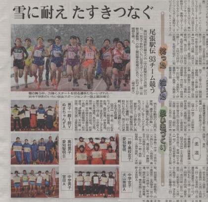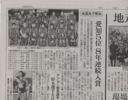 中日新聞さんありがとうございます。今日も本校生徒をたくさん載せて頂けました。県内版(26面)では野津里実さんの記録や写真など、みんなのスポーツ(22面)では尾張駅伝で優勝した男子宮田Aチームと3位に入った女子Aチームが載っていました。