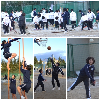 昨日と今朝はインフルエンザのため部活動ができませんでした。また、運動場の南側は校舎の陰になり、凍土状態です。いつも陸上部が使用していますので、凍てついた雪を皆で力を合わせ削り取っています。