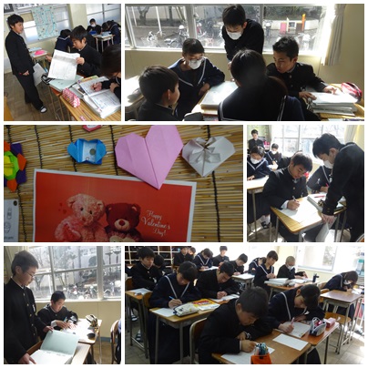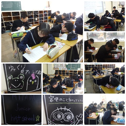 数学ではちょうど、勉強時間の数字を用いた授業だったので、質問してみました。昨日の勉強時間で、2時間以上が40%近くいたのには驚きました^−^テストが2週間後ということもあり、スタートを切っている人たちも出てきたようですね♪