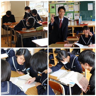 受験指導の裏では、教室で卒業文集の文章を考えたり、対策問題でわからない所を教え合ったりしている場面がありました。いい雰囲気ですね!