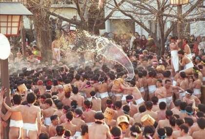何と言ってもすごいのが、神男が、警護の者に守られて裸男の群れの中に密かに登場してからです。裸男達は、その神男に触れて厄を落とそうと、神男に殺到し凄まじい揉み合いになります。浴びせられる手桶(ておけ)の水は、裸男たちの摩擦の熱でたちまち湯煙となるのです。