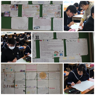 英語の教室に入るとみんなが英語を使って書いた掲示物がずらり!