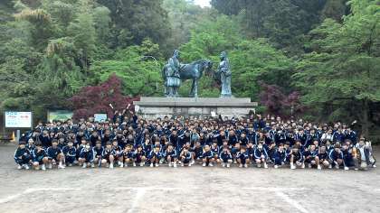 郡上に到着し、山内一豊と妻の像の前で学年写真を撮りました。