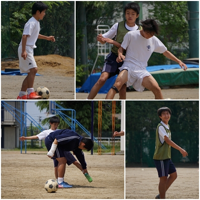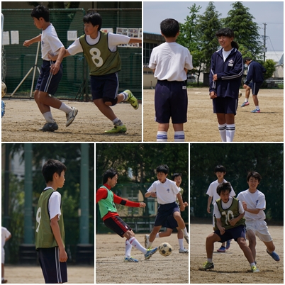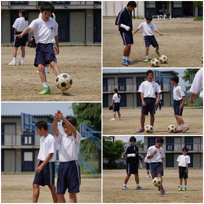 ケガをして、サッカーができない3年生の齋藤君は、自分のできることを考えて1年生にボールを蹴るコツを繰り返し指導していました。
