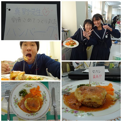 昨日(9日)は1、2時間目に1年2組で調理実習があり、「顧問の先生に作りたい!」と荒川さん、尾関さん、水野さんが宮國先生に申し出てくれました!荒川さん、水野さんの班が作ってくれ、見た目もよく、焼き加減、味付けもバッチリで、チーズとの相性も抜群でした!メッセージ通り愛情たっぷりでとても美味しいハンバーグでした!!「顧問の先生に」と思ってくれたことが最高にうれしかったです!お腹も心も幸せな気分で満腹です!!荒川さん、尾関さん、水野さん、美味しいハンバーグ、ごちそうさまでした(*^_^*)荒川さん、水野さんと一緒に作ってくれた班のメンバーにも感謝です。ありがとうございました!