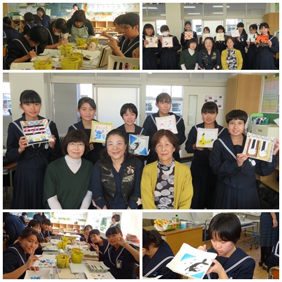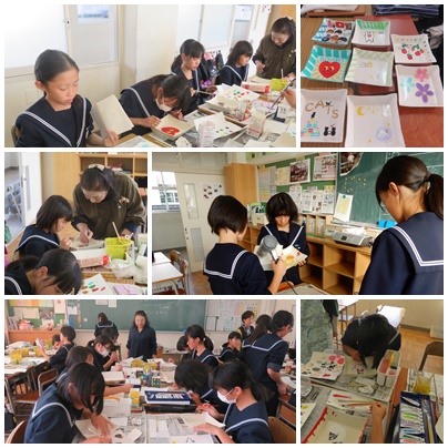 先生から「下書きは書かなくていい。自分で書いてきたデザインを見て直接書けばいいよ。その方が大胆なおもしろい作品になっていくから。。。」と生徒たちからは、戸惑いの姿がありました。時間がたつにつれて、こだわりがでてきてラメのアクリル絵の具をもらうと「少し入れるだけで、全然違う」と。先生からほんの少しアドバイスをいただいただけで見違えるほどの世界に1つだけの作品たちが仕上がりました。