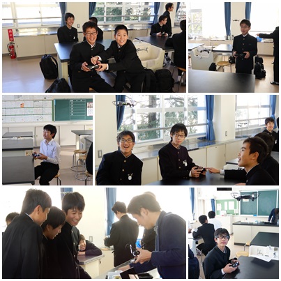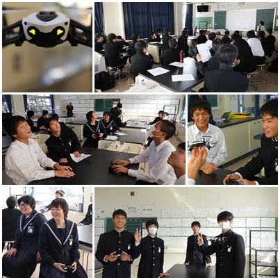 ドローン体験では、3種類のドローンの操縦体験をさせていただきました。初めてのドローンにどの生徒も興味津々で操縦していました。また、ドローンの活用方法や法律なども教えていただき本当に貴重な体験をすることができました。