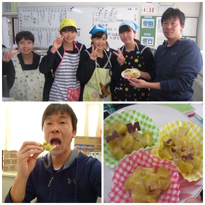 3、4時間目に3年3組が調理実習を行い、伊藤さん、オオシマさん、大野さん、松浦さんが、「鬼まんじゅう」を作ってもってきてくれました。自分はもう学年を離れているので、作ってくれただけでもうれしいのに、サツマイモの皮でイニシャルや愛のメッセージがデコレーションされており、この一工夫にさらにうれしさ倍増です!!本当に食べるのがもったいなかったですが、美味しくいただかせていただきました。作ってくれた伊藤さん、オオシマさん、大野さん、松浦さん、ごちそうさまでした。うれしさと美味しさで思わず涙が…。まさに「鬼の目に涙」でした!!