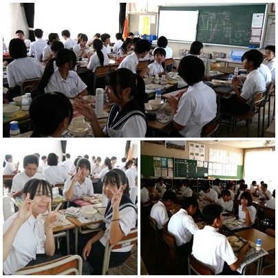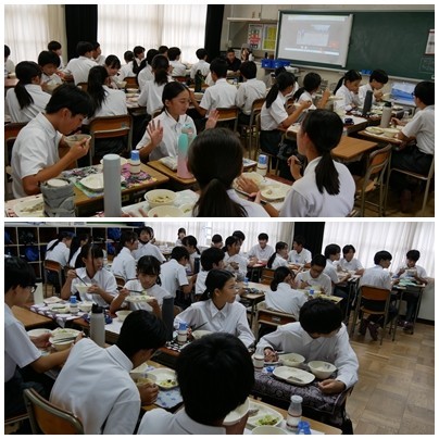 2年生 給食の様子です。体育大会、ソーランの動画を見ながら給食を食べています。
