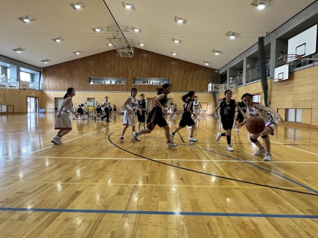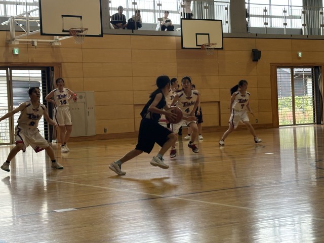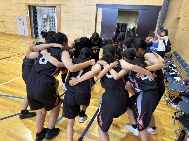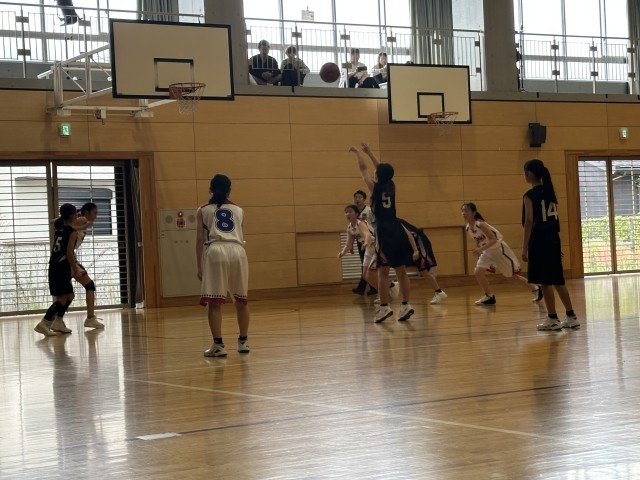 今回の大会を迎えるにあたり、生徒達には①全力プレー②試合前、試合中、試合後のコミュニケーション③全力の声出しをやりきろうと伝えました。今日の2試合はまさに、それらを体現した試合だったと思います。どちらの試合でも誰も下を向くことなく最後まで走りぬき、声を掛け続けていました。滝中学校との試合ではスタートから緊張気味だった1年生に代わり2年生が先輩としてのガッツを見せつけました。そのおかげもあり、1年生の緊張も消え、全員がいいプレーをすることができました。そこに、フォローしながらチームで戦う姿を見ることができたと思います。第3Qでは、1点リードの残り30秒が本当に長く感じました。「ボール!」「取れー!」「守れ―!」とひたすら叫ぶベンチと、最後の最後にピンチになった際もなんとか追いつきリバウンドをもぎり取ったプレイヤー。終了の笛が鳴っても思わず全員がなんの笛だと思うくらい、目の前のことに必死でした。終了の笛と分かったとき、生徒たちと大喜びしました。このチームでの初勝利。そして顧問である自分にとっても初勝利でした。紛れもなく、みんなの努力のおかげです。メニューも、なにもかも自分たちで考えて、話し合い、努力した甲斐がありましたね。本当におめでとう!