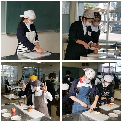1年生 家庭科の授業の様子です。リンゴを包丁で切っています。