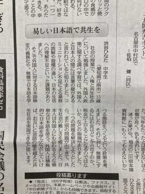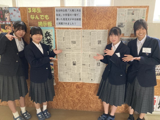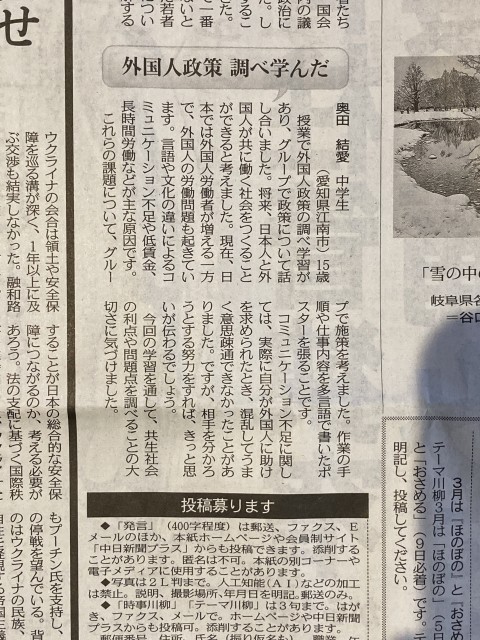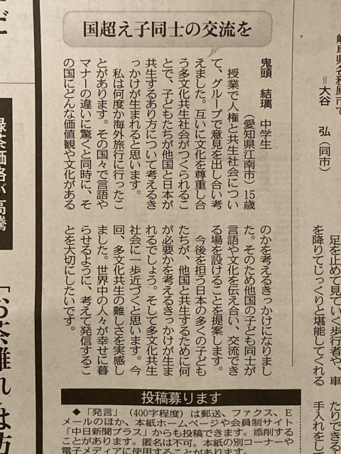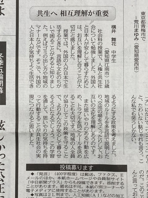 3年生社会科公民「人権と共生社会」の学習の一環で、書いた意見文が中日新聞に掲載されました!