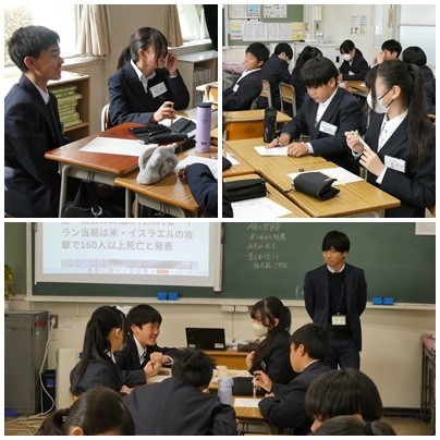 1年生 社会「平和な世界を築くために私たちができることは?」の授業の様子です。