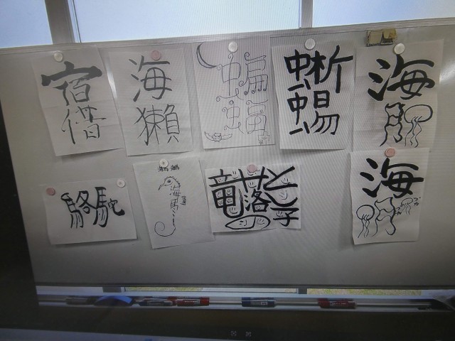 書道部の作品が完成しました。今回は、海の生き物や陸の生き物の読み方を確認し、その動物のイメージでそれぞれ文字に表現しました。何の生き物か分かりますか。
