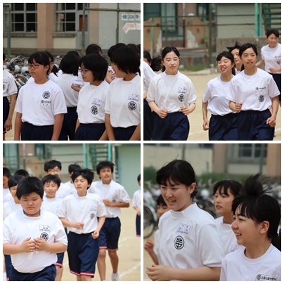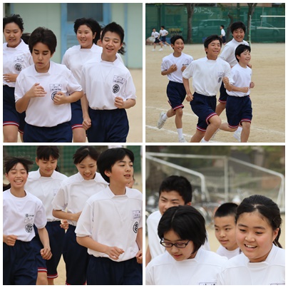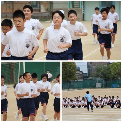 1年生は、体育の授業で「5分間走」を行っていました。今日は、「自分のペースで5分間走ること」が目的です。スピードは重視せず、「5分間歩かず走りきること」を目指しました。