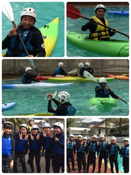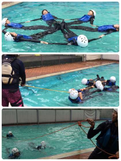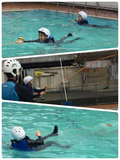 プールでカヌー体験を行なっています。また、川で溺れた人がいた場合の救助の方法も教えてもらっています。