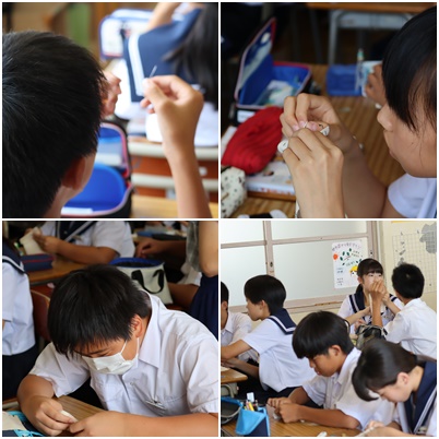 2年生は、家庭科で裁縫の授業を行っていました。今日は、縫い目の強度を考えて、「かえし縫い」の練習を行っていました。