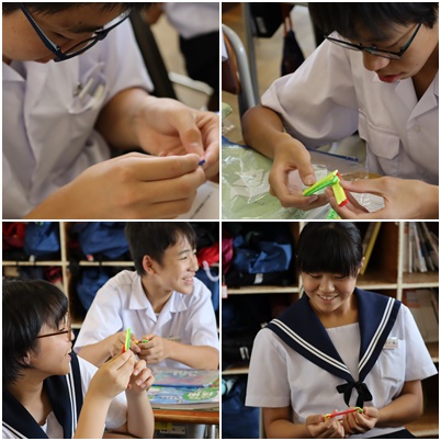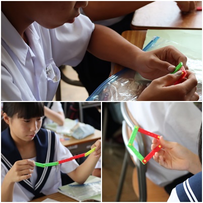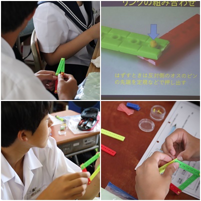 2年生は、技術の時間に「動きを伝達する仕組みと特徴」の授業を行っていました。今日は「リンク装置」の学習です。リンク装置とは、金属やプラスチックの棒など数個をピンでとめて一定の運動を行うようにつくられたものです。リンクの長さやピンの種類を変えることによって、回転運動を搖動運動や往復直線運動などに変えたり、その逆の運動にも変換できたりもします。