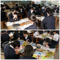 デザインした仮面が、だんだん立体的になってきました。ユニフォームのそでやテニスラケットのガット1本1本まで丁寧に粘土で表現している生徒もいました。着色に入っている生徒もいました。