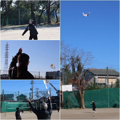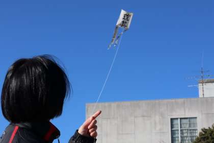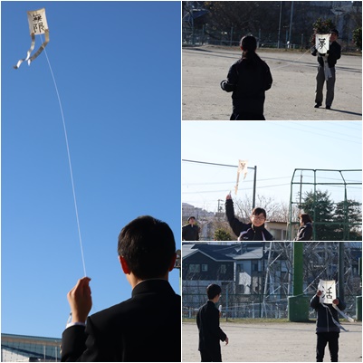 書道部は、自分で書いた文字の凧を作って運動場であげていました。
