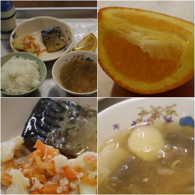 ごはん、ぎゅうにゅう、さばのおかかに、カリフラワーとにんじんのあえもの、しょうがのとろみじる、いよかん です。